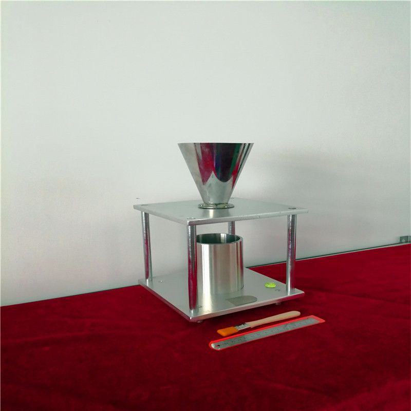 FT-103A活性白土堆积密度测定装置原理:粉尘从漏斗口在一定高度自由落下充满量杯;测定松装状态下量杯内单位体积的质量,即堆积密度。将待测的试样装入漏斗,顺着漏斗的下端口自然下落并流入到测量筒中,将落入到测量筒中的试样刮平,在天平上称取刮平后测量筒中的试样质量,再除以测量筒的容积,就可以测出待测产品堆积密度。