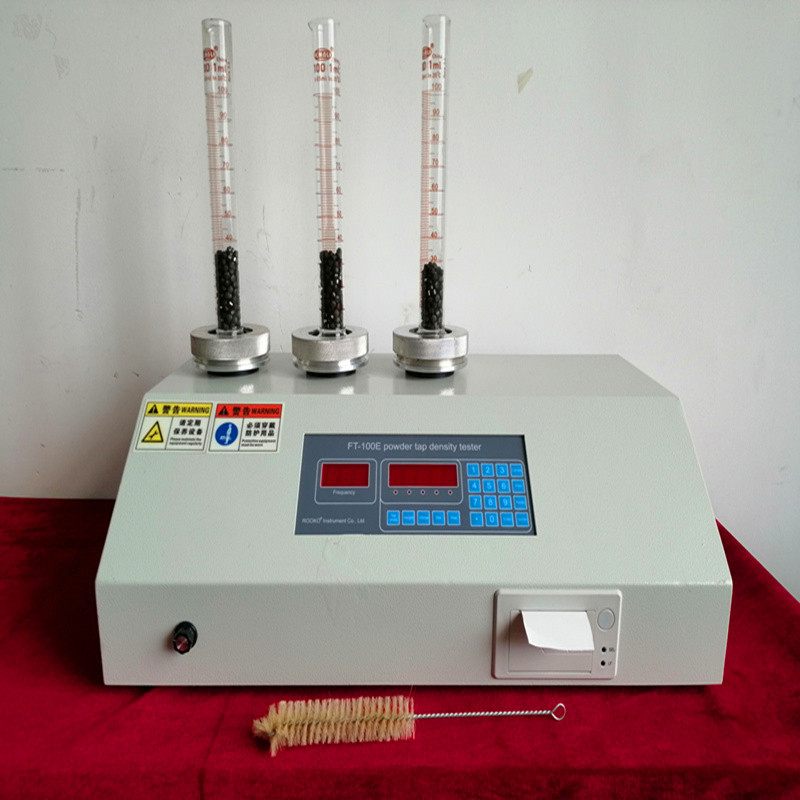 FT-100E多功能粉末堆密度仪由称为振实密度测试仪、振实密度计、振实密度测定仪、敲击密度仪、拍击密度测试仪、粉末体积密度仪等因行业不同和使用环境不同故而有多名之称;基本工作过程是将粉末量筒固定在机械振动装置上,振动电机带动机械振动装置上下振动,装有粉末的刻度试管随机械振动装置而发生有节拍的振动,随着振动次数的增加,量筒里的粉末逐渐振实,振动次数达到设定的次数后,机械振动装置停止振动,读出刻度试管的体积,根据密度的定义:质量除以体积、从而求出振实后的粉末密度。